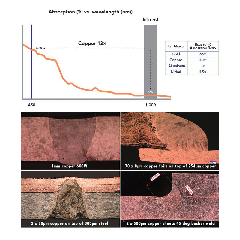 和近紅外激光相比,藍(lán)光能夠明顯改善,甚至實(shí)現(xiàn)IR激光器不可能實(shí)現(xiàn)的加工過程和加工窗口。即使在同等功率情況下,藍(lán)光波長優(yōu)于綠光波長。