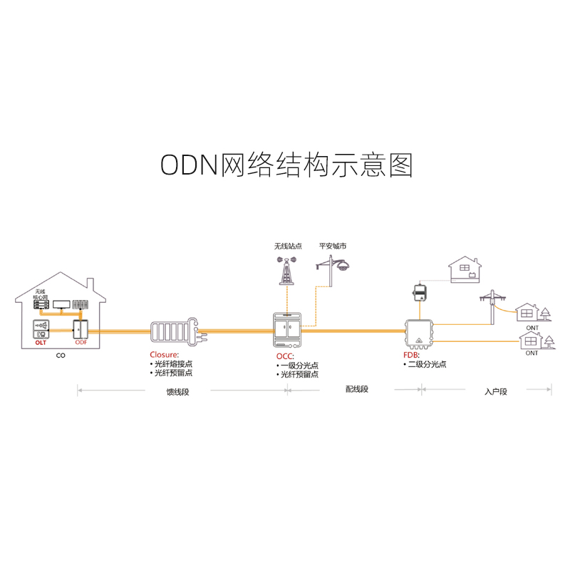 ODN 是無源光網(wǎng)絡(luò)(PON, Passive Optical Network) 從通信中心機(jī)房(CO, Central Office)的光線路終端(OLT, Optical Line Terminal)到達(dá)用戶側(cè)的光網(wǎng)絡(luò)單元(ONU, Optical Network Unit)或光網(wǎng)絡(luò)終端設(shè)備(ONT, Optical Network Terminal)所經(jīng)由的光傳輸通道。ODN 網(wǎng)絡(luò)設(shè)施位于中心機(jī)房和用戶側(cè)的中間,由多種無源設(shè)施、器件組成,起到光纖互聯(lián)或交叉連接、光纖接續(xù)、光功率分配/ 波長(zhǎng)分配及光路的保護(hù)等作用。