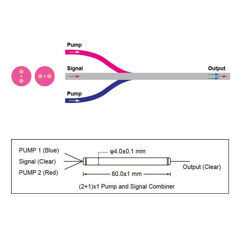 (2+1)×1多模泵浦&信號合束器專門設(shè)計用來應(yīng)用于高功率光纖激光器,光纖放大器領(lǐng)域,將2路多模泵浦光和1路信號光合成進(jìn)入單根雙包層光纖,信號光走纖芯,泵浦光走包層,實(shí)現(xiàn)泵浦光和信號光在同一根光纖中傳輸。泵浦效率高,插入損耗低,單臂承受功率高達(dá)300W,性能穩(wěn)定可靠。