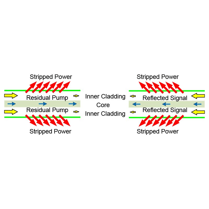 在高功率光纖激光器和光纖放大器中,泵浦光與信號(hào)光在摻雜光纖中經(jīng)過能量交換,泵浦減弱,信號(hào)增強(qiáng),泵浦能量無法全部被吸收,總會(huì)有所殘留,并在雙包層光纖的外包層中傳輸(如793nm,808nm,915nm, 940nm, 976nm等),這部分能量往往是不需要的,而且可能對(duì)后續(xù)器件造成傷害,用CPS可以有效“剝除”包層內(nèi)的殘余泵浦甚至是內(nèi)包層返回的反射信號(hào)光,而在纖芯中傳輸?shù)男盘?hào)光能夠被很好的保持,包括信號(hào)光功率和光束質(zhì)量因子(M2)。