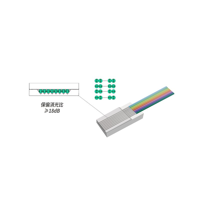 保偏光纖陣列(PM-FA)多應(yīng)用于相干光通信,保偏光纖能夠使光波在傳輸過程中保持光波的偏振態(tài)不變,可以充分發(fā)揮相干接收的優(yōu)越性。保偏光纖陣列是利用V型槽(即V槽,V-Groove)把一條保偏光纖帶安裝在陣列基片上,在保證光波偏振穩(wěn)定措施下能夠?qū)崿F(xiàn)高度密集并行傳輸