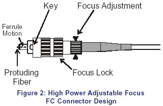高功率 FC型連接器的一個(gè)獨(dú)特的設(shè)計(jì)是這種連接器具有可調(diào)聚焦的功能,這種特別的連接器可以用來調(diào)整光纖伸出插芯的長(zhǎng)度,從而精確定位光纖在air-gap 中的位置,使用者可以通過調(diào)整光纖連接器的散件(不旋轉(zhuǎn)光纖本身)實(shí)現(xiàn)對(duì)聚焦大小的調(diào)整,這對(duì)激光到光纖的耦合是非常理想的。