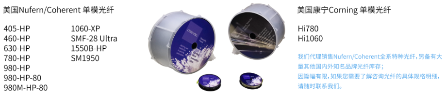 3.光纖類型,優(yōu)先選用美國(guó)Nufern/Coherent品牌單模系列光纖,常用型號(hào)有:405-HP、460-HP、630-HP、780-HP、980XP、980-HP、980-HP-80、980M-HP-80、1060-XP、1550B-HP等和美國(guó)康寧SMF28-Ultra光纖,詳細(xì)光纖規(guī)格資料請(qǐng)聯(lián)系我們的銷售人員獲取;(或者可提供以下要求供推薦參考:1.工作波長(zhǎng),例如633nm,1060nm等,光纖芯徑/包層,例如4/125:488nm、5/125:633nm、6/125:850nm、7/125:980nm、8/125:1310nm、9/125:1550nm等)
