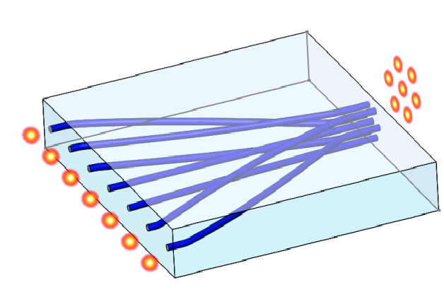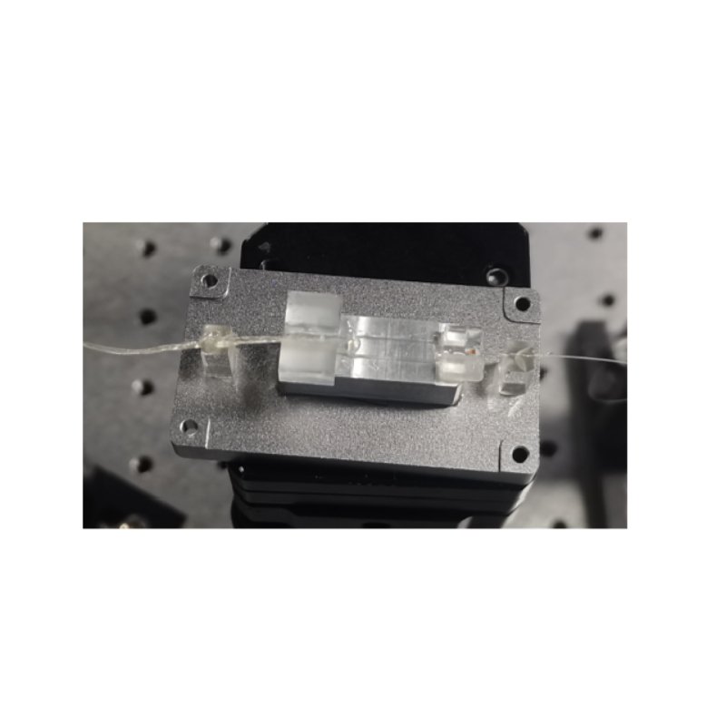 多芯光纖是空分復(fù)用技術(shù)的一種。由于多芯光纖和單模光纖在尺度和結(jié)構(gòu)上的不同,我們使用基于三維光波導(dǎo)的扇入扇出(Fan-in Fan-out, FIFO)器件實(shí)現(xiàn)多芯光纖的復(fù)用和解復(fù)用。芯片一端為一維波導(dǎo)陣列,另一端是與多芯光纖匹配的三維結(jié)構(gòu)。